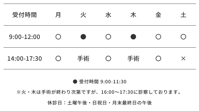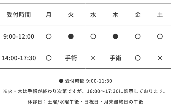 ● 受付時間 9:00-11:30 / ※手術 16:00-17:30